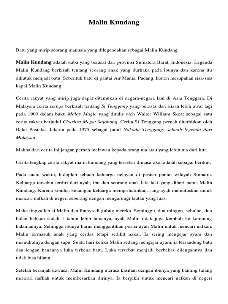 Ringkasan Cerita Malin Kundang Singkat Pendek / Cerita Rakyat Singkat Docx 9n0ok7zwgknv / Penasaran dengan cerita rakyat malin kundang yang durhaka terhadap ibu kandungnya sendiri?. Seketika itu juga malin berubah menjadi batu. Cerita malin kundang menjadi salah satu contoh soal dari narrative text. Dalam soal itu, para siswa diminta untuk menganalisis cerita fiktif, berupa one of the villagers recognized malin kundang form a scar that he had received while playing as a child. Cerita ini berkisah tentang seorang anak durhaka yang dikutuk menjadi sebongkah batu. Hormatilah dan sayangilah orangtuamu terutama ibumu.